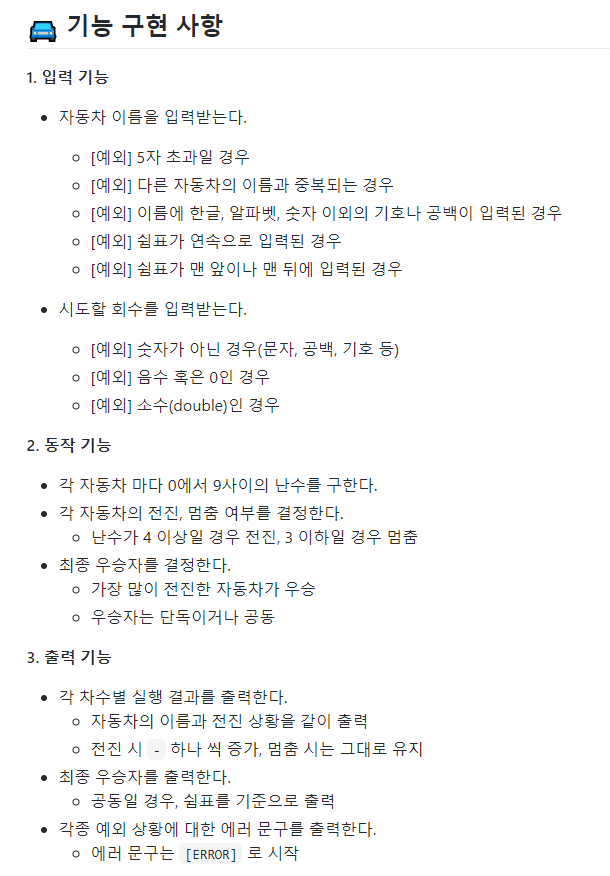 2주차 자동차 경주 게임의 기능 구현 사항 이번에는 기능 구현 사항을 작성하는데 1시간 정도밖에 걸리지 않았습니다.